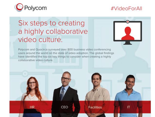 I have been away for a few years and am happy to see that Polycom is still going strong and, this is major; that they changed their logo. I ran across the below graphic while surfing, so I downloaded the report and snipped and posted the very cool graphic “Six Steps to Creating a Highly Collaborative Video Culture” below (I hope they don’t mind the extra advertising). Note: I can’t believe that the videoconferencing experience is still not totally intuitive to everyone after 25 + years in existence….wow.