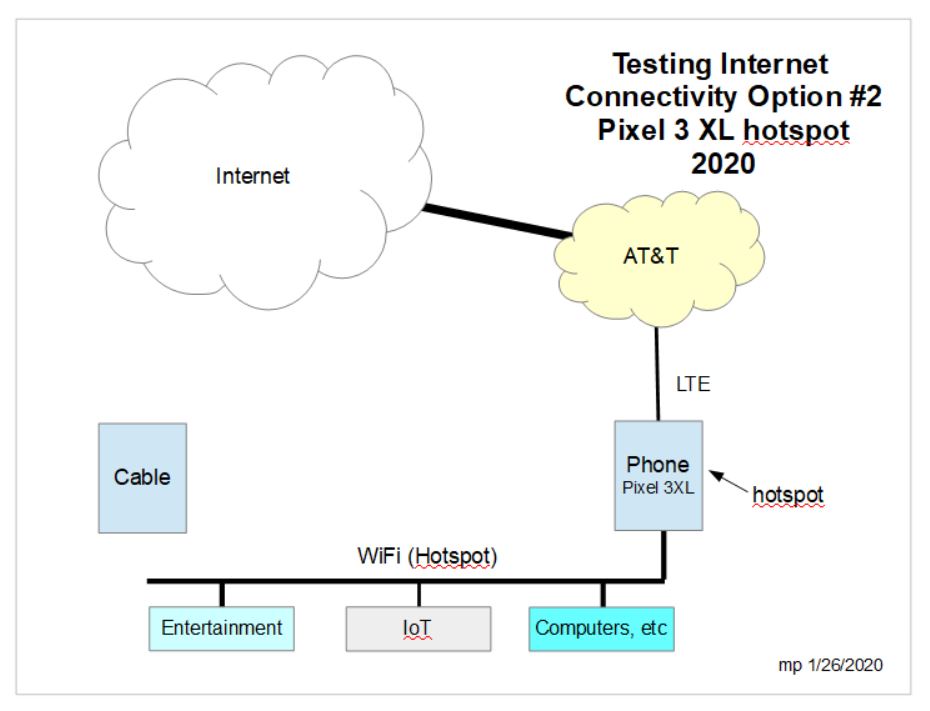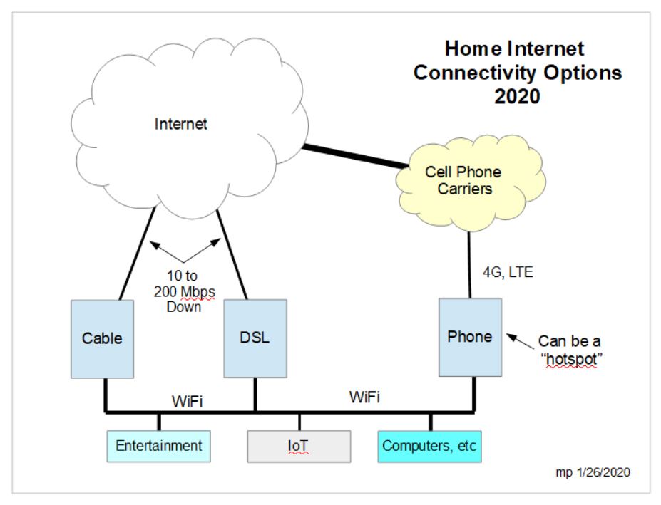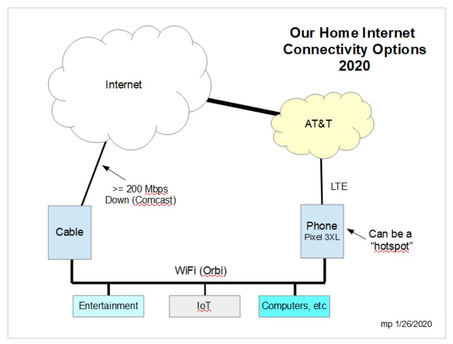 Figure 1 shows a typical home / office connection to the Internet. WiFi connects TV’s, Computers, IoT (Internet of Things) devices (Refrigerators, Thermostats, etc) to the Internet via either a cable modem or DSL. Your smartphone (Pixel, Samsung, iPhone, etc) connects to the Internet either via your chosen carrier, or, like what we do, via cable or DSL while you are at home.