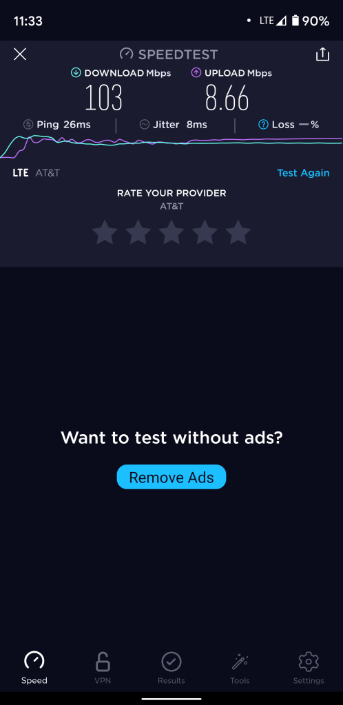 The speeds dropped a bit, well…..a lot, but, watching the short on Disney+ was indistinguishable (go figure!) from Test #1. We are good! 🙂 In fact, this is a great backup in case our Comcast Internet goes down.