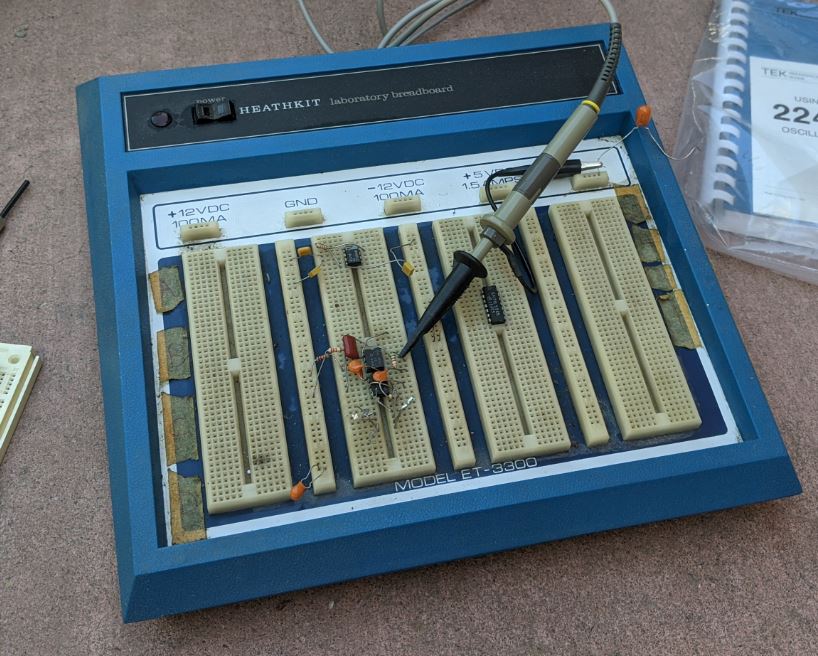 For my concept designs, I like using a breadboard that lets me to just plug-in the components and connect wires by also just plugging them in. My Dad bought me a Heathkit breadboard for my work bench a zillion years ago, I think Heathkit is now gone (Looks like Heathkit is baaacck. :-). But….this thing still works, and up until a few years ago, I still used it! I guess if I had an idea for a design, I could still use it. I may just give it a whirl…