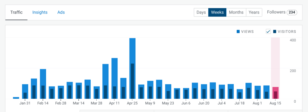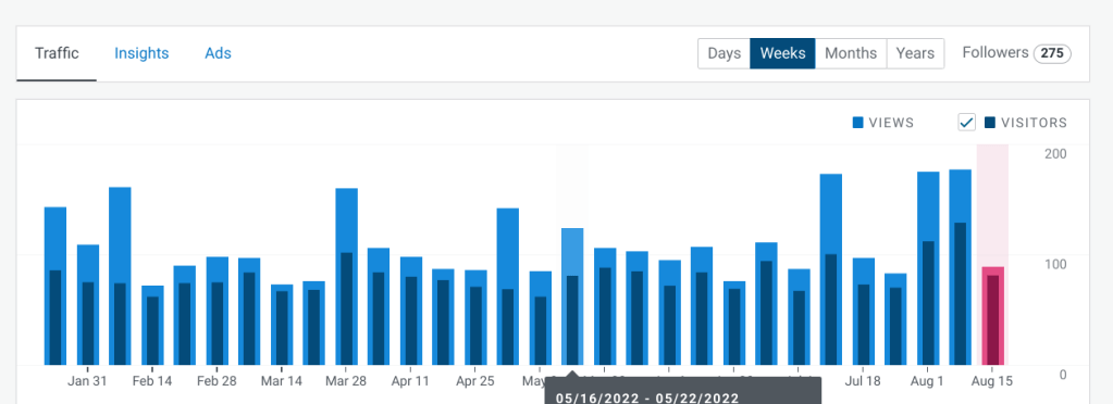 Update August 29, 2022: Daily traffic is too granular to track. BUT…..weekly traffic is better, and if I am patient, monthly and yearly would be even better.