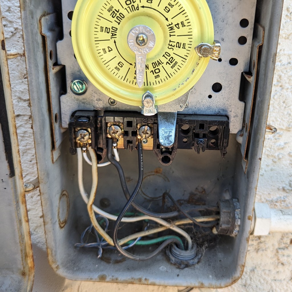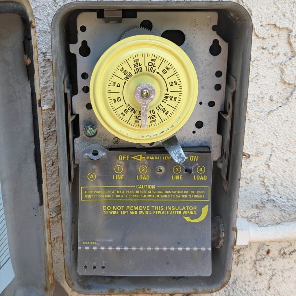 On another topic……the best hint Mike at Leslie’s gave me was to take the on/off tabs off my yellow timer and just let it run! No need for an electrician, unless I want to neaten things up a bit.