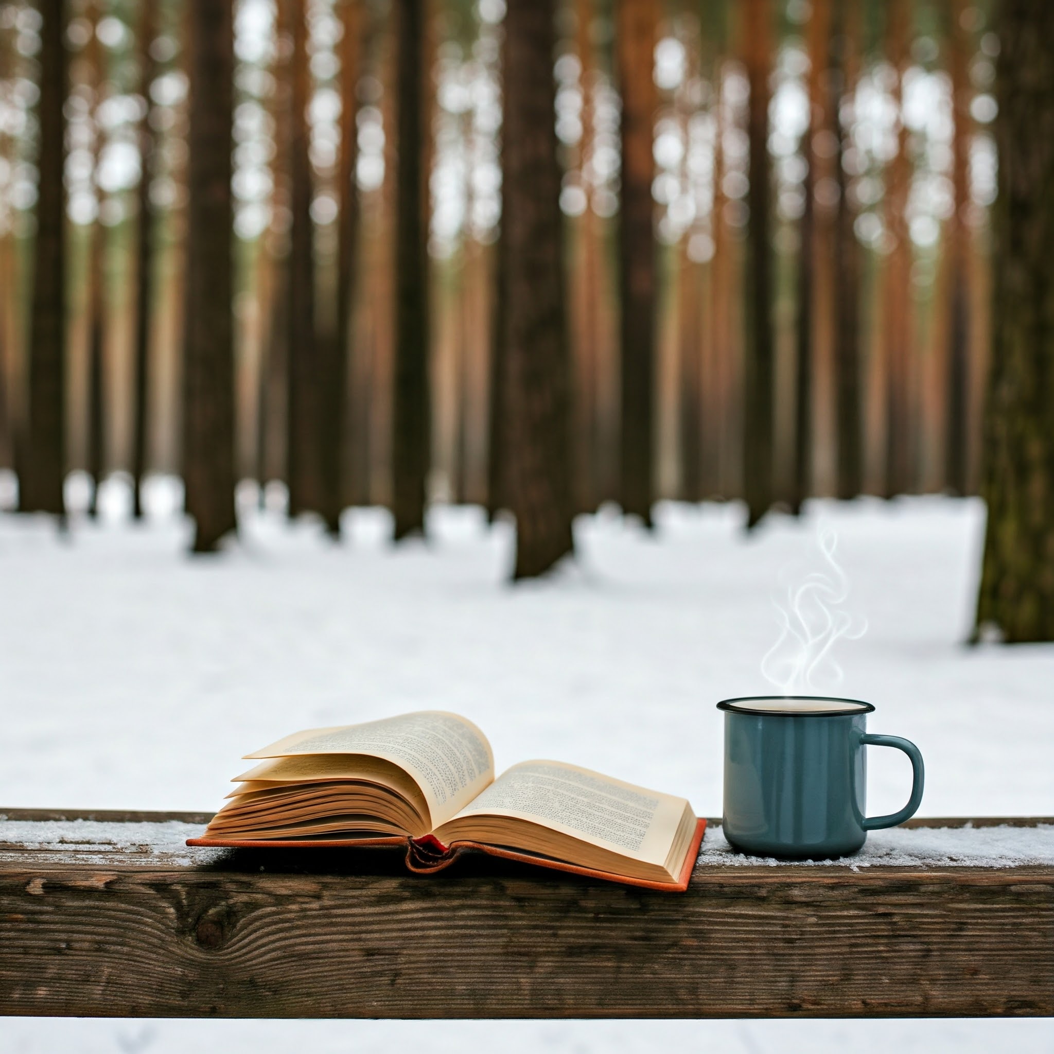 open book, on a bench, on a snowy day, in the woods, with a coffee mug also on the bench