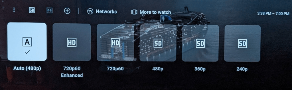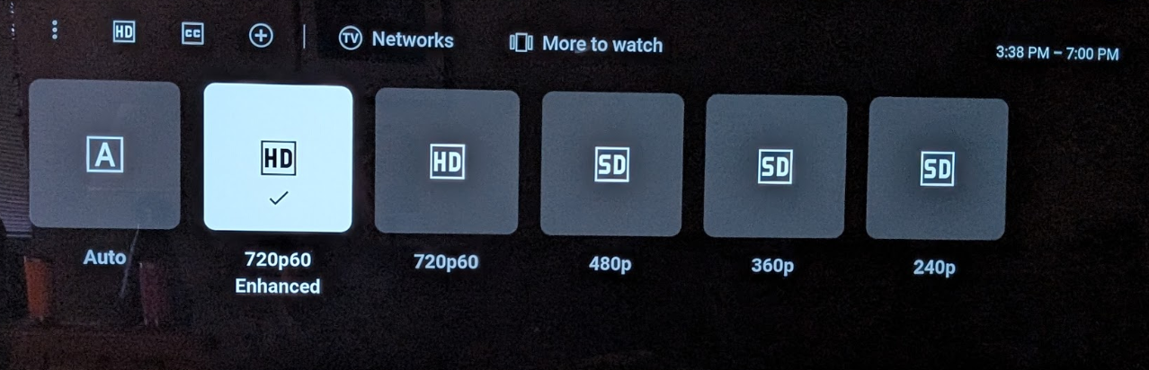 I quickly moved the resolution to the “720p60 Enhanced” option and enjoyed a very good to excellent picture for the remainder of the Eagles win! See pic below.